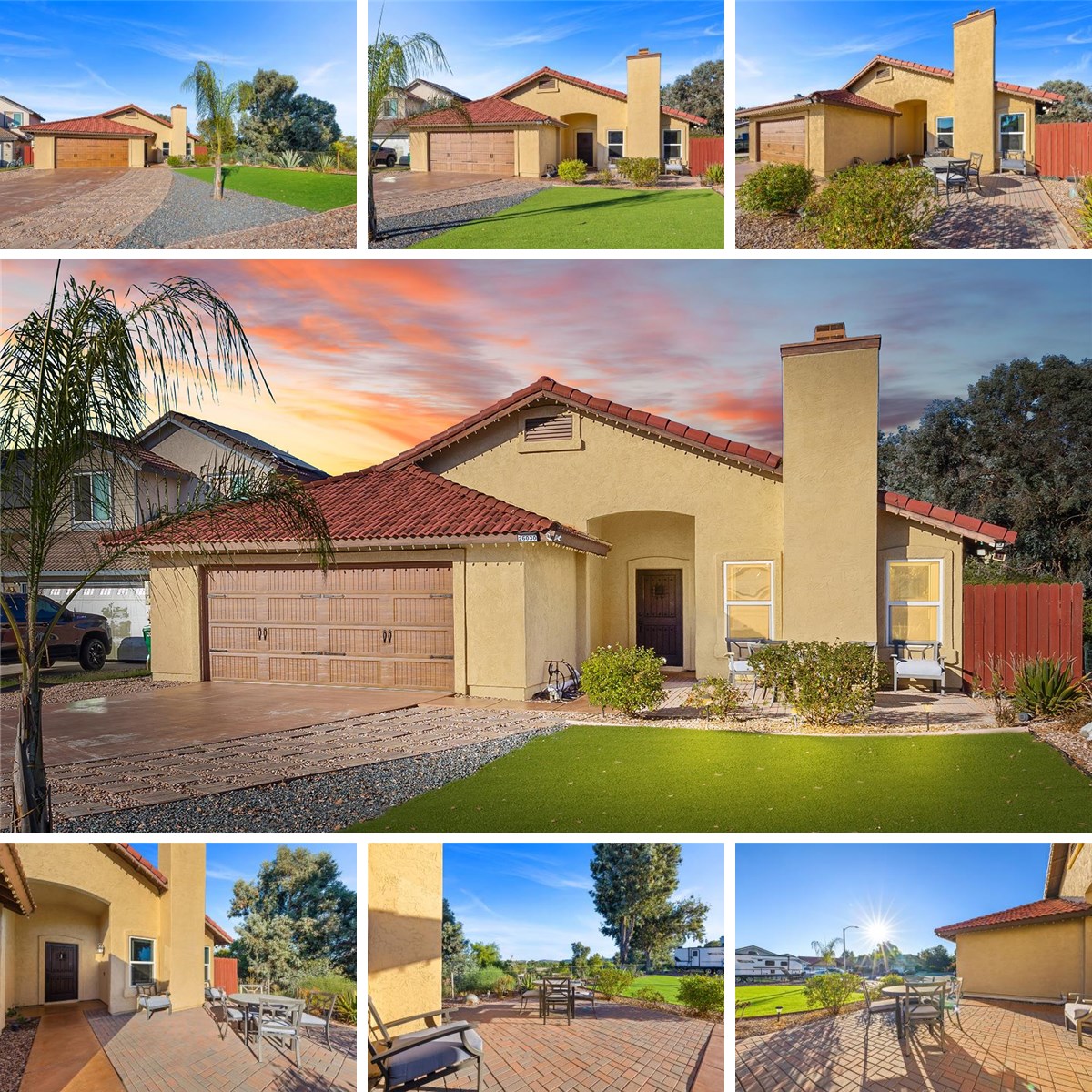 Welcome to this BEAUTIFUL 3-Bedroom, 2-Bathroom SINGLE STORY, Cul-De-Sac home offering 1,354 sq. ft. of living space on a 5,663 sq. ft. lot. This home has been thoughtfully upgraded and sits at the end of a cul-de-sac with no neighbors on the right side. LOW TAX and NO HOA! When you pull up to the home you notice the BEAUTIFUL Barn Style Garage Door, paved driveway, large front patio area with artificial grass, drought resistant plants, fresh exterior paint and RV PARKING. The front door is Solid, Rustic Mahogany with a speakeasy and timeless appeal. When you enter, the home opens to Vaulted ceilings in the Living Room and lots of natural light. New windows were installed and help keep the home energy efficient. SOLAR was recently installed so the AC can be cranked up! The entry, family room, dining room, kitchen, and hallways feature ceramic tile flooring that looks like wood. The bedrooms and bathrooms have oak wood flooring for added warmth. The heart of the home is the Kitchen with New White Quartz Countertops, trendy backsplash and stainless steel appliances. On one side of the kitchen is an informal dining area and on the other side is the formal dining room with a fireplace and decorative wood inlay walls. Perfect for entertaining, the Backyard is a private retreat, with hardscape, two gazebos for chillaxing, artificial grass, and a built-in fire pit with seating. There are citrus trees and a lush grapevine that extends along the back fence. All Bedrooms and Bathrooms have new paneled doors. Both bathrooms have been fully renovated with tiled showers, new toilets, sinks, and modern lighting. The Primary Bedroom faces the backyard, has a good size walk-in closet, and an ensuite Bathroom. The 2-Car Garage has been drywalled and the ceiling was insulated for added comfort and function. Located in an excellent school district, the home is also conveniently located near shops, supermarkets, great restaurants, and the 215 and 15 Freeways. It is easy to get around town and to commute for work. The Temecula Wine Country is 15 minutes away! Come see this incredible opportunity to live in the heart of Murrieta.